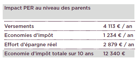 Les époux Dupont ont une tranche marginale d’imposition (TMI) de 30%. Ils décident d’ouvrir un PER au nom de leur fille mineure de 16 ans, avec un versement de 4 113 € (plafond de l’année). Cette dernière n’ayant jamais utilisé ses plafonds d’épargne retraite, l’intégralité du versement est déductible des revenus du foyer. Les parents vont donc venir réduire le montant de leurs revenus imposables à hauteur de 4 113 €. En gommant ces revenus, ils réalisent une économie d’impôt de 1 234 € (TMI de 30% x 4 113 €).