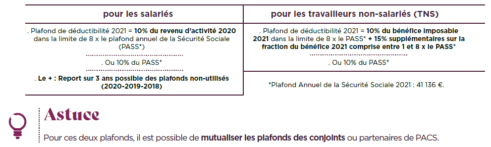 Le premier avantage repose sur la possibilité de déduire l’intégralité des sommes versées sur le PER du revenu imposable, et donc de l’impôt sur le revenu dans la limite des plafonds suivants :