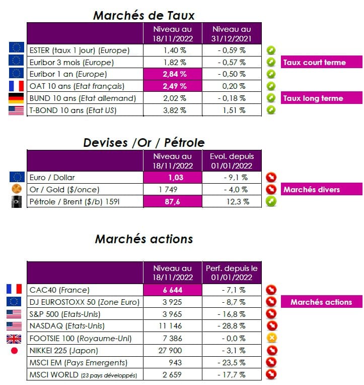 La thématique de la hausse des prix et des taux d’intérêt reste bien présente. Les marchés financiers, toutefois, ont continué de remonter la pente, regagnant, pour le Cac 40, + 18 % depuis son dernier point bas de fin septembre.